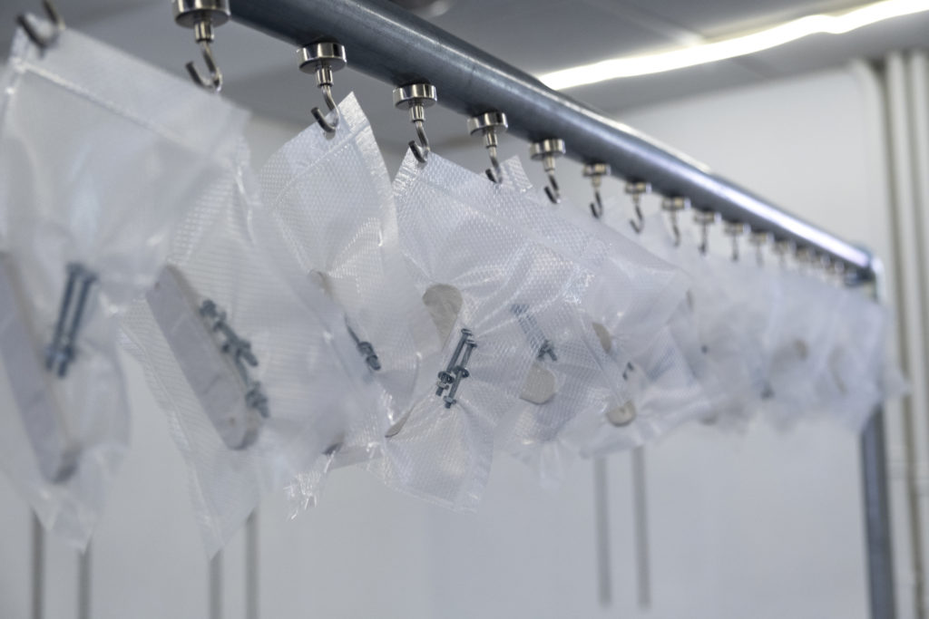 plâtre, sachets polyéthylène, boulons, crochets, portant en acier, dimensions variables.